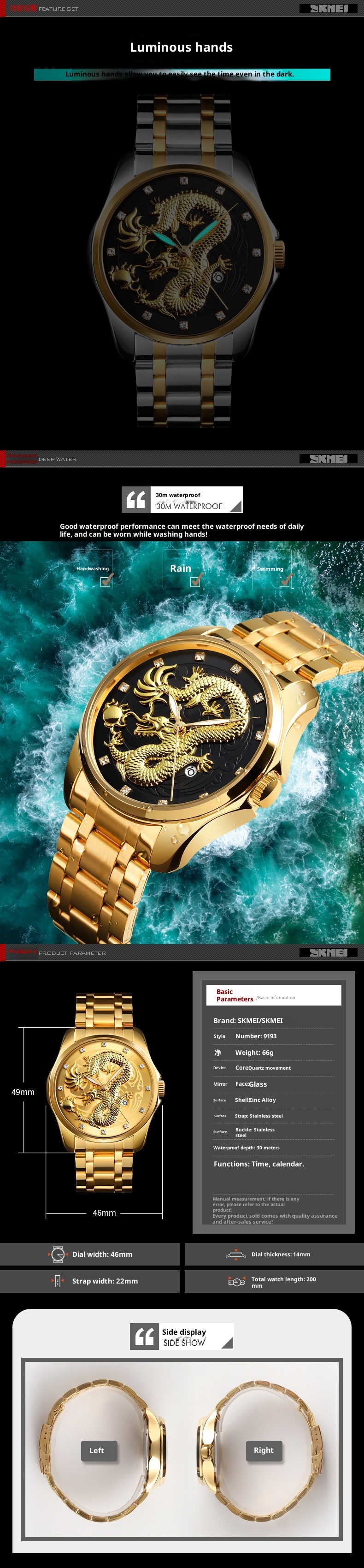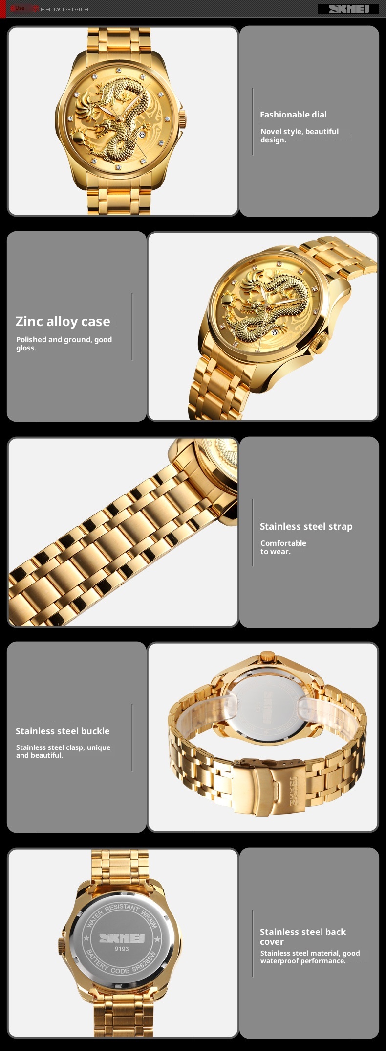 Material: zinc alloy case, stainless steel strap, high transparent glass mirror, stainless steel bottom cover, stainless steel buckle