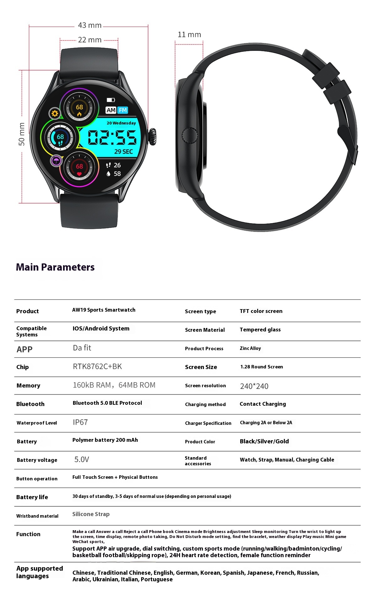 Packing List: Color box, watch, manual, charging cable